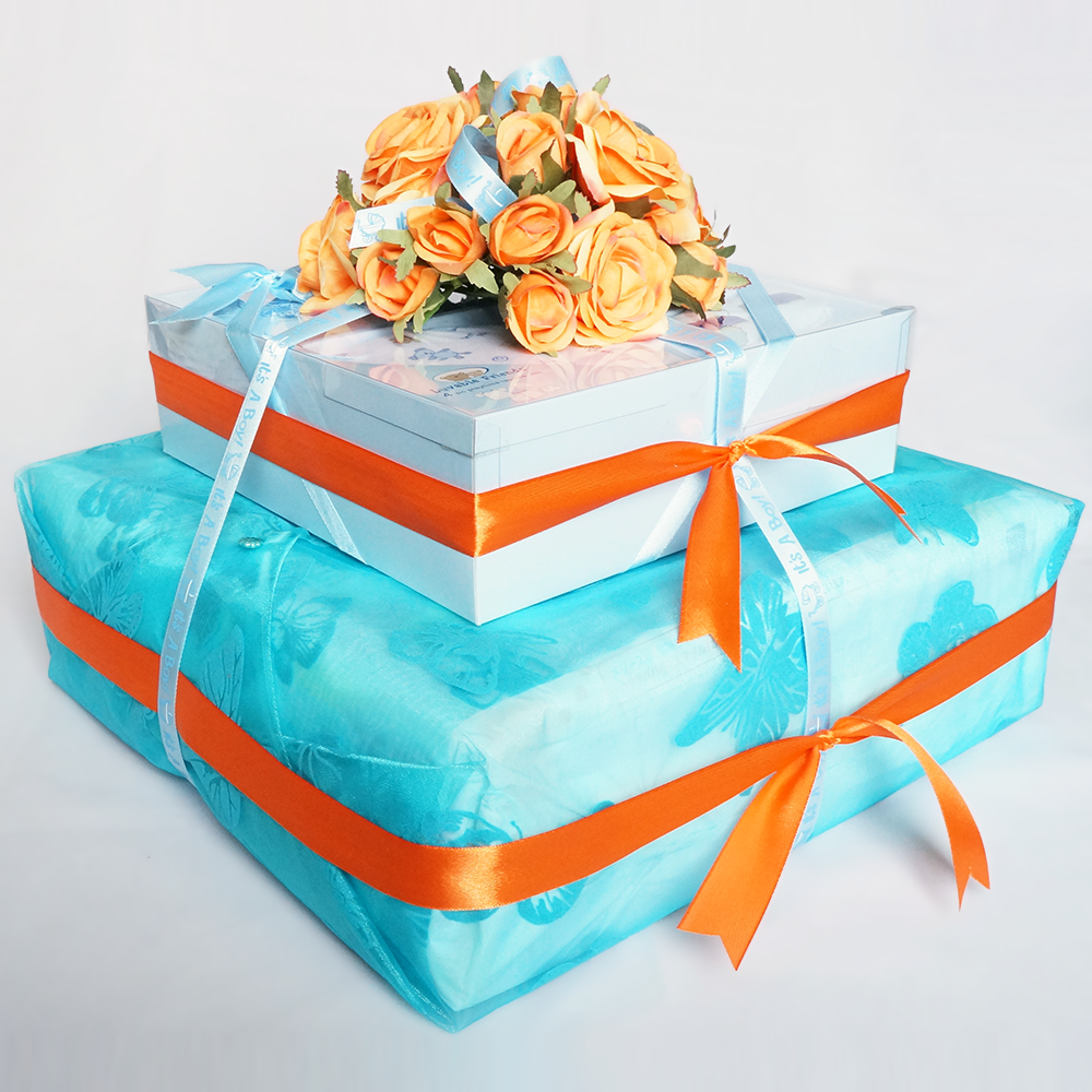 Торт из памперсов декорирован цветами, шелковыми ленточками, упакован в оригинальную упаковку, и оформлен пышным бантом. Роскошный подарок на выписку из роддома!